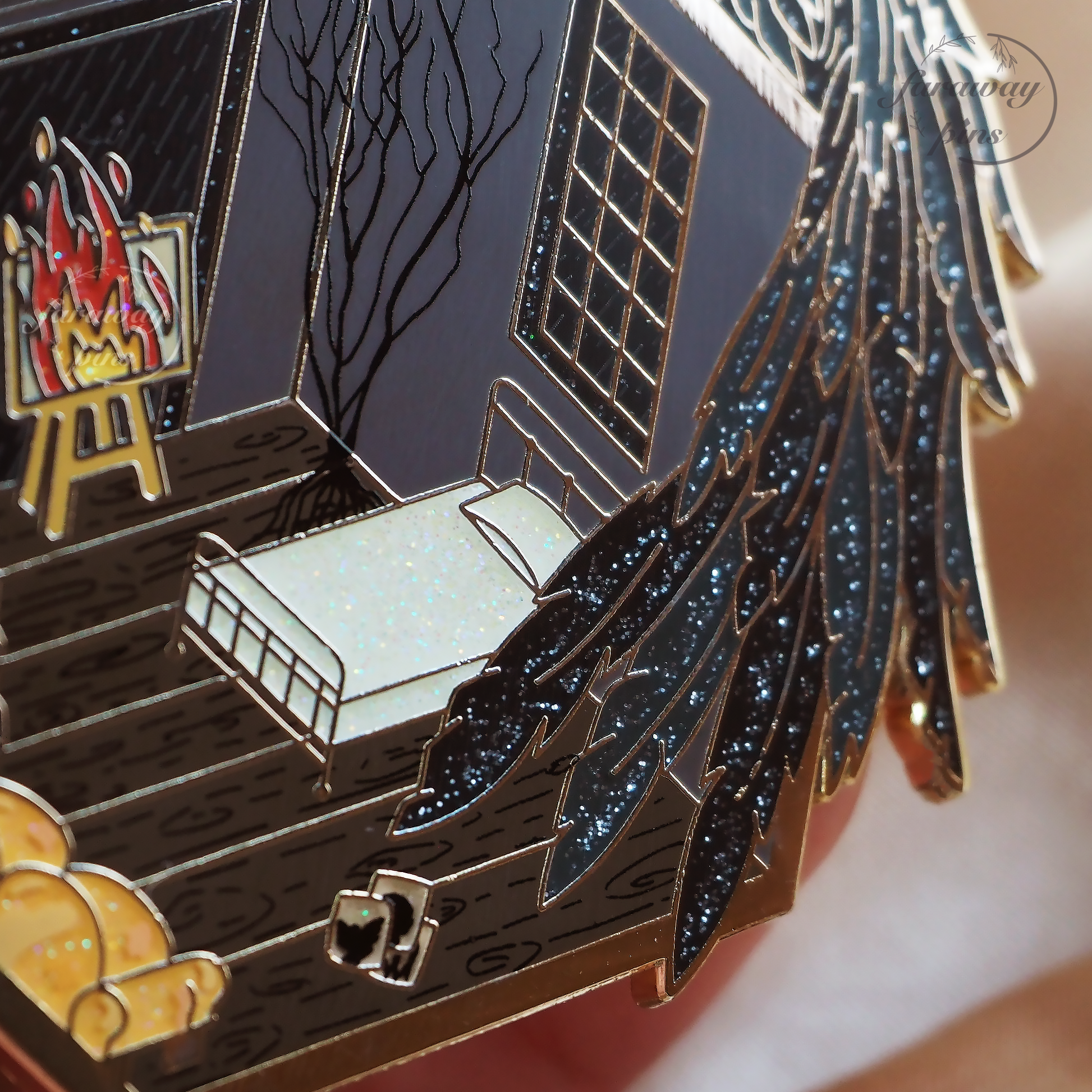 • hard enamel + silver & rainbow glitter + screen printing